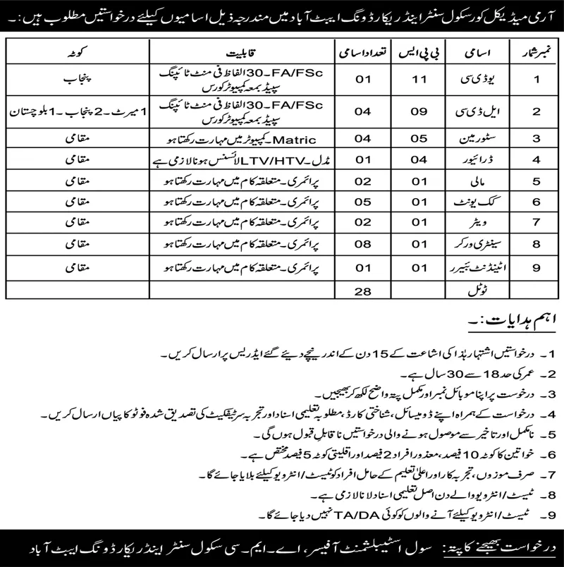 - Application Address: Civil Establishment Officer, AMC School Center and Recording Abbottabad