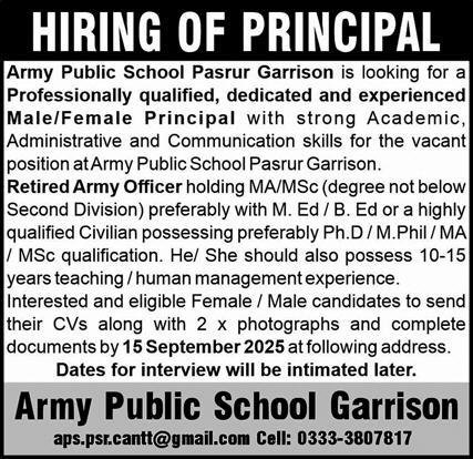 - Position: Principal (Male/Female) with strong Academic, Administrative, and Communication skills at Army Public School Pasrur Garrison.