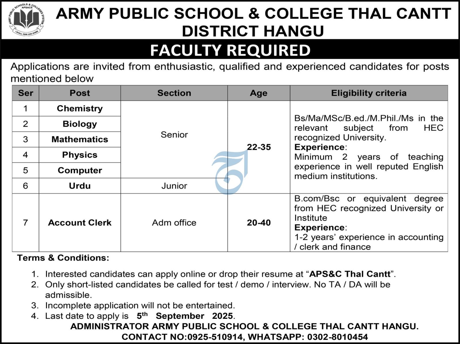 Army Public School & College Thal Cantt Jobs 2025 announce the Contract career opportunities for the post of See Below Ad in Balochistan, Hangu for the fresh and experienced candidates on Contract basis who have Check Advertisement degree. Posted date of this post is 02/09/2025 and the last date is 05/09/2025. if you are eligible for this job apply before due date.
