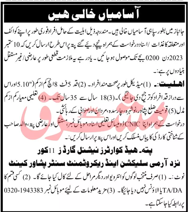 Army Selection & Recruitment Centre Peshawar Jobs 2023 announce the Contract career opportunities for the post of See Below Ad in Khyber Pakhtunkhwa, Peshawar for the fresh and experienced candidates on Contract basis who have Check Advertisement degree. Posted date of this post is 02/09/2023 and the last date is 16/09/2023. if you are eligible for this job apply before due date.