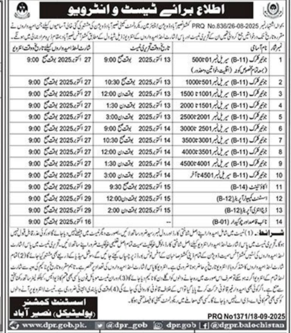Assistant Commissioner Political Naseerabad Jobs Test Interv announce the Contract career opportunities for the post of See Below Ad in Balochistan, Nasirabad for the fresh and experienced candidates on Contract basis who have Check Advertisement degree. Posted date of this post is 19/09/2025 and the last date is 16/10/2025. if you are eligible for this job apply before due date.