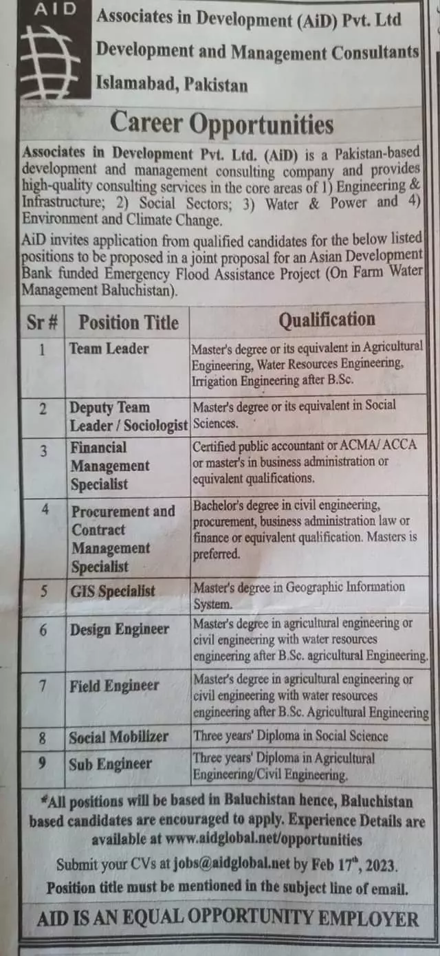 Associate In Development Pvt Ltd AID Balochistan Jobs 2023 announce the Contract career opportunities for the post of See Below Ad in Balochistan, Quetta for the fresh and experienced candidates on Contract basis who have Check Advertisement degree. Posted date of this post is 12/02/2023 and the last date is 17/02/2023. if you are eligible for this job apply before due date.