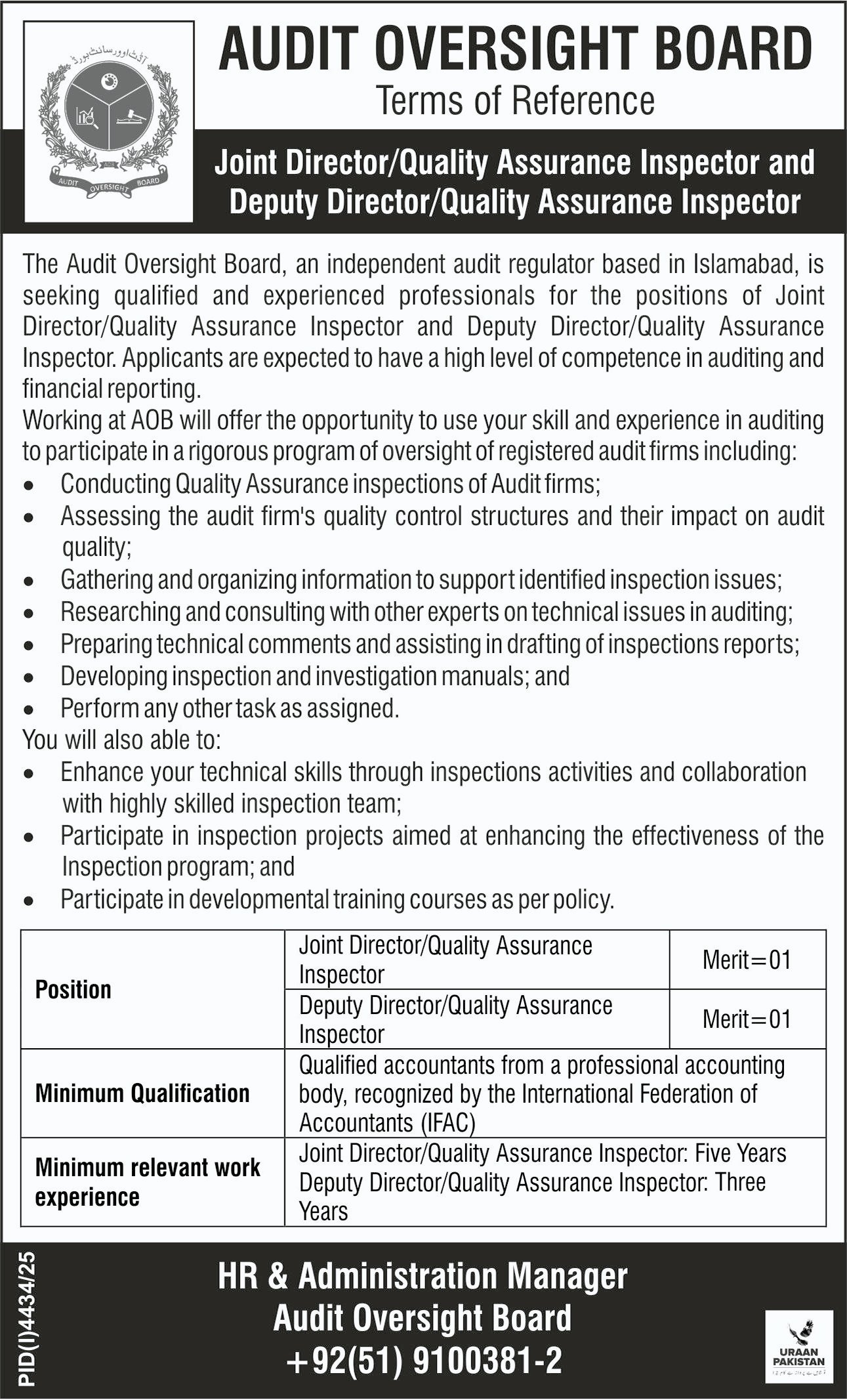 Audit Oversight Board AOB Islamabad Jobs 2025 announce the Contract career opportunities for the post of See Below Ad in Federal, Islamabad for the fresh and experienced candidates on Contract basis who have Check Advertisement degree. Posted date of this post is 30/11/2025 and the last date is 15/12/2025. if you are eligible for this job apply before due date.