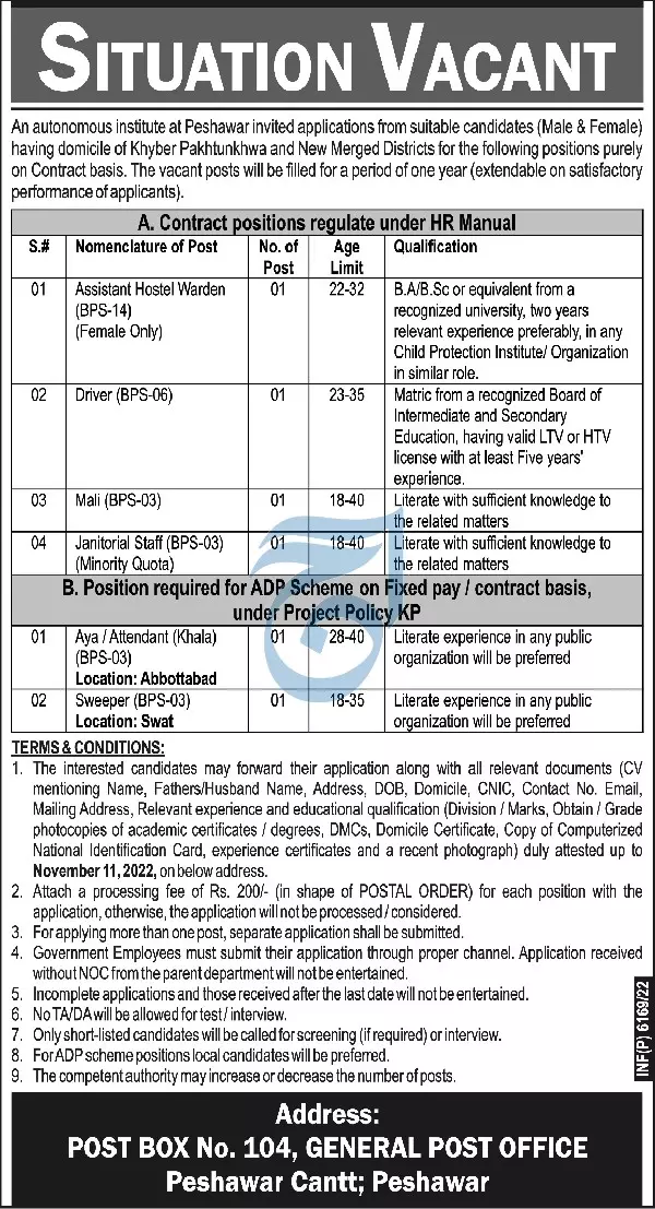Autonmous institute at Peshawar Jobs 2022 announce the Contract career opportunities for the post of See Below Ad in Khyber Pakhtunkhwa, Peshawar for the fresh and experienced candidates on Contract basis who have Graduation degree. Posted date of this post is 26/10/2022 and the last date is 11/11/2022. if you are eligible for this job apply before due date.