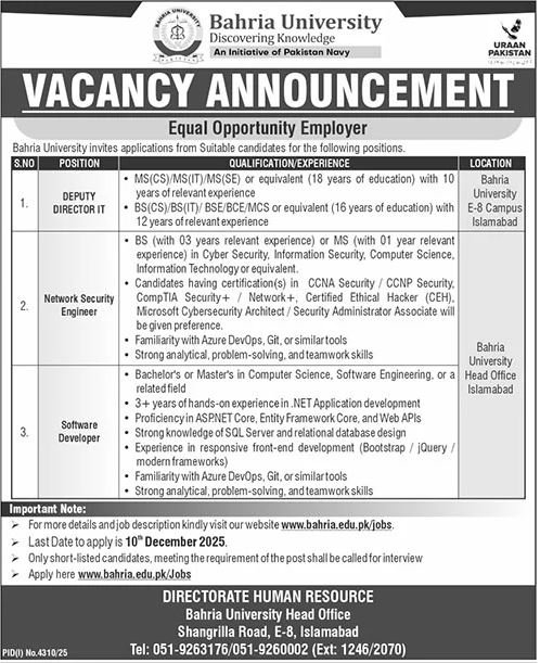 Bahria University Islamabad Jobs 2025 announce the Contract career opportunities for the post of See Below Ad in Federal, Islamabad for the fresh and experienced candidates on Contract basis who have Check Advertisement degree. Posted date of this post is 23/11/2025 and the last date is 10/12/2025. if you are eligible for this job apply before due date.