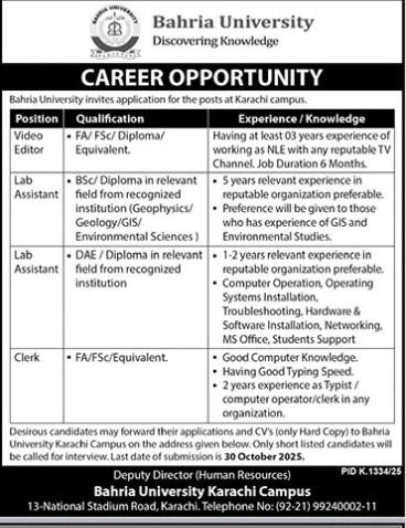 Desirous candidates may forward their applications and CV's (only Hard Copy) to Bahria University Karachi Campus on the address given below. Only short listed candidates will be called for interview. Last date of submission is 30 October 2025.
