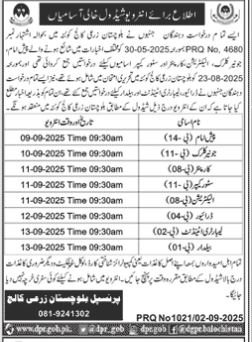 All applicants who applied for the positions of Jochatan Agricultural College, Balochistan, as per advertisement number 30-05-2025, published in newspapers, and PRO No. 4680, for the posts of Junior Clerk, Electrician, Lab Assistant, and Store Keeper, and who appeared in the written examination on 23-08-2025 at Balochistan Agricultural College, Quetta, as well as all applicants who applied for the positions of Naib Qasid, Ehwa Dar, and Beldar, are hereby informed through this newspaper that their interviews will be held at Balochistan Agricultural College, Quetta, according to the following schedule: