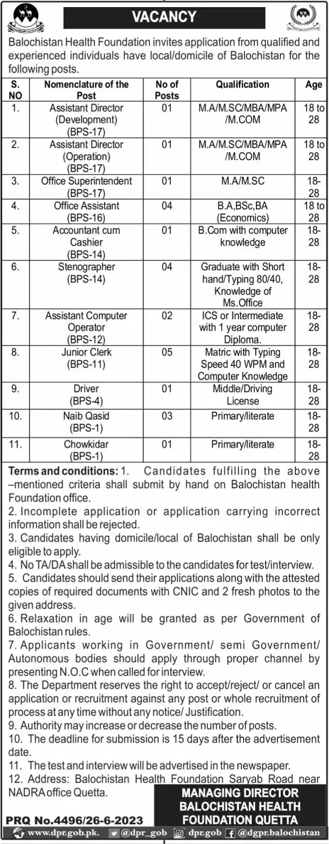 - Candidates fulfilling the above -mentioned criteria shall submit by hand on Balochistan health Foundation office.