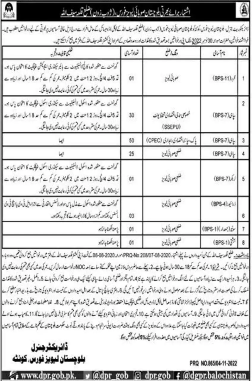 Balochistan Levies Force Killa Saifullah Jobs 2022 announce the Permanent career opportunities for the post of See Below Ad in Balochistan,Killa Saifullah for the fresh and experienced candidates on Permanent basis who have Check Advertisement degree. Posted date of this post is 04/11/2022 and the last date is 30/11/2022. if you are eligible for this job apply before due date.