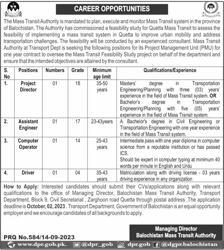 Balochistan Mass Transit Authority Quetta Jobs 2023 announce the Contract career opportunities for the post of See Below Ad in Balochistan, Quetta for the fresh and experienced candidates on Contract basis who have Check Advertisement degree. Posted date of this post is 15/09/2023 and the last date is 02/10/2023. if you are eligible for this job apply before due date.