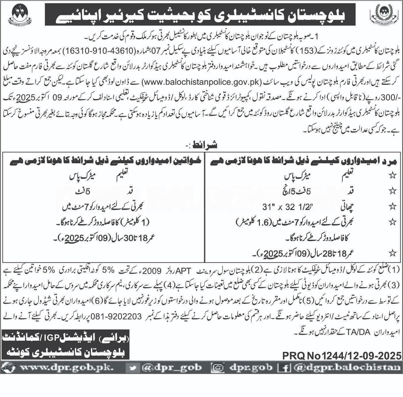 Applications are invited from eligible candidates for the anticipated 153 vacant posts of Constables in Quetta Zones of Balochistan Constabulary, with Basic Pay Scale No. 7 (Serial No. 43610-910-16310) including admissible allowances, as per the conditions given below. Interested candidates can obtain recruitment forms free of charge from the office of Balochistan Constabulary Headquarters, Badar Line, Gulistan Road, Quetta, or download them from the Balochistan Police website. However, a non-refundable fee of Rs. 300/- must be paid at the time of submission. Attach attested copies of educational certificates, computerized National Identity Card, and Local/Domicile Certificate and submit them to Balochistan Constabulary Headquarters, Badar Line, Gulistan Road, Quetta by October 09, 2025. The number of vacancies may increase or decrease. The competent authority reserves the right to cancel recruitment without assigning any reason, which cannot be challenged in any court of law.