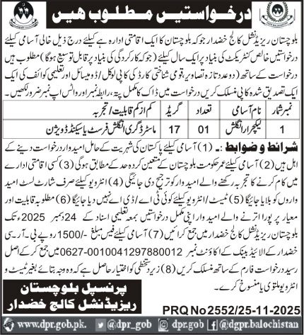 Balochistan Residential College Khuzdar Job 2025 announce the Contract career opportunities for the post of See Below Ad in Balochistan, Khuzdar for the fresh and experienced candidates on Contract basis who have Check Advertisement degree. Posted date of this post is 26/11/2025 and the last date is 24/12/2025. if you are eligible for this job apply before due date.