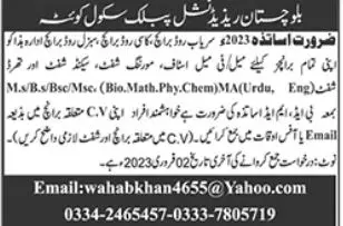 - Balochistan Residential Public School jobs advertisement dated about 30 January 2023 in daily Jang Newspaper invites application for the vacant post of maths teacher, english teacher, urdu teacher, physics teacher, chemistry teacher and biology teacher in Quetta, quetta Balochistan Pakistan. Educational qualifications required M.sc and MA etc.