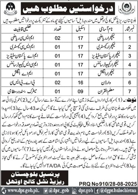 Balochistan Resiential College Uthal Lasbela Jobs 2025 announce the Contract career opportunities for the post of See Below Ad in Balochistan, Bela for the fresh and experienced candidates on Contract basis who have Check Advertisement degree. Posted date of this post is 29/08/2025 and the last date is 12/09/2025. if you are eligible for this job apply before due date.