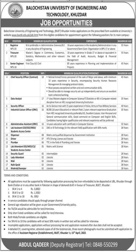 Balochistan university of Engineering & Technology Khuzdar Jobs announce the Permanent career opportunities for the post of See Below Ad in Balochistan,Khuzdar for the fresh and experienced candidates on Permanent basis who have Check Advertisement degree. Posted date of this post is 13/03/2022 and the last date is 15/04/2022. if you are eligible for this job apply before due date.