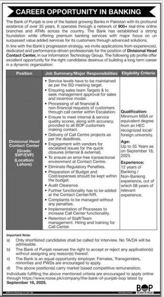 Bank of Punjab Lahore Jobs 2025 announce the Contract career opportunities for the post of See Below Ad in Punjab, Lahore for the fresh and experienced candidates on Contract basis who have Check Advertisement degree. Posted date of this post is 06/09/2025 and the last date is 16/09/2025. if you are eligible for this job apply before due date.