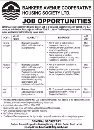 Bankers Avenue Cooperative Housing Society Ltd Lahore Jobs announce the Contract career opportunities for the post of See Below Ad in Punjab, Lahore for the fresh and experienced candidates on Contract basis who have Check Advertisement degree. Posted date of this post is 10/04/2022 and the last date is 20/04/2022. if you are eligible for this job apply before due date.