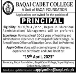 - Vacant posts including principal are announced in Baqai Cadet College Karachi, karachi Sindh Pakistan as per 2 April 2023 advertisement in daily Jang Newspaper. Persons with M.sc, MA and M.ed etc. education can apply.