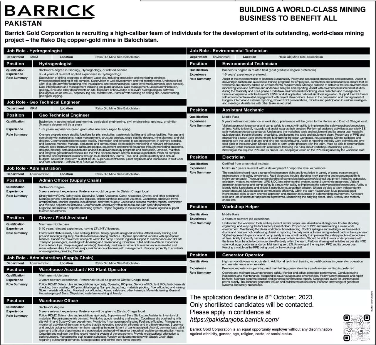 Barrick Pakistan Balochistan Jobs 2023 announce the Contract career opportunities for the post of See Below Ad in Balochistan,Quetta for the fresh and experienced candidates on Contract basis who have Check Advertisement degree. Posted date of this post is 23/09/2023 and the last date is 08/10/2023. if you are eligible for this job apply before due date.