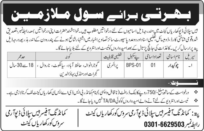Base Supply Depot Kharian Cantt Job 2026 announce the Contract career opportunities for the post of See Below Ad in Punjab for the fresh and experienced candidates on Contract basis who have Check Advertisement degree. Posted date of this post is 18/02/2026 and the last date is 05/03/2026. if you are eligible for this job apply before due date.