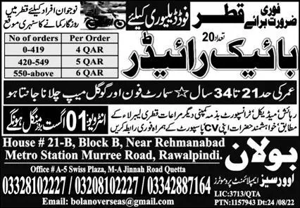 Bike Rider & Rider Jobs 2023 In Qatar announce the Contract career opportunities for the post of See Below Ad in Qatar for the fresh and experienced candidates on Contract basis who have Check Advertisement degree. Posted date of this post is 31/07/2023 and the last date is 01/08/2023. if you are eligible for this job apply before due date.
