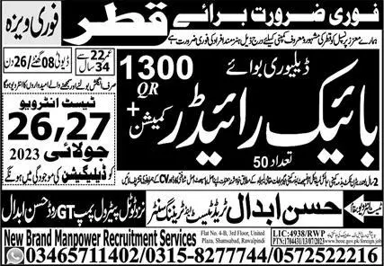 Bike Riders Jobs in qatar 2023 announce the Contract career opportunities for the post of See Below Ad in Qatar for the fresh and experienced candidates on Contract basis who have Check Advertisement degree. Posted date of this post is 25/07/2023 and the last date is 27/07/2023. if you are eligible for this job apply before due date.