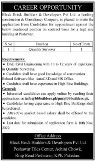 Black Brick Builders and Developers Pvt Ltd Jobs 2022 announce the Contract career opportunities for the post of See Below Ad in Khyber Pakhtunkhwa, Peshawar for the fresh and experienced candidates on Contract basis who have Graduation degree. Posted date of this post is 02/11/2022 and the last date is 10/11/2022. if you are eligible for this job apply before due date.