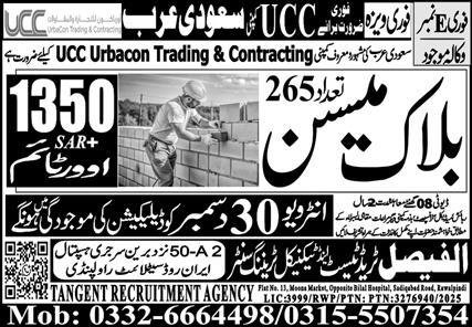 Block Mason Jobs in Saudia Arabia 2025 announce the Contract career opportunities for the post of See Below Ad in Saudi Arabia for the fresh and experienced candidates on Contract basis who have Check Advertisement degree. Posted date of this post is 27/12/2025 and the last date is 30/12/2025. if you are eligible for this job apply before due date.