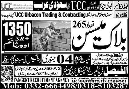 Block Mason Jobs in Saudia Arabia 2026 announce the Contract career opportunities for the post of See Below Ad in Saudi Arabia for the fresh and experienced candidates on Contract basis who have Check Advertisement degree. Posted date of this post is 31/12/2025 and the last date is 04/01/2026. if you are eligible for this job apply before due date.