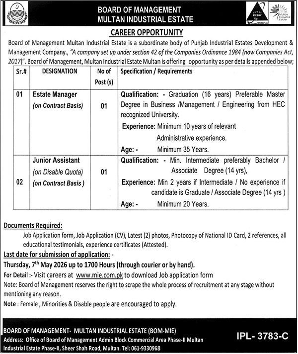 Board Of Management Multan Punjab Jobs 2026 announce the Contract career opportunities for the post of See Below Ad in Punjab, Lahore for the fresh and experienced candidates on Contract basis who have Check Advertisement degree. Posted date of this post is 18/04/2026 and the last date is 07/05/2026. if you are eligible for this job apply before due date.