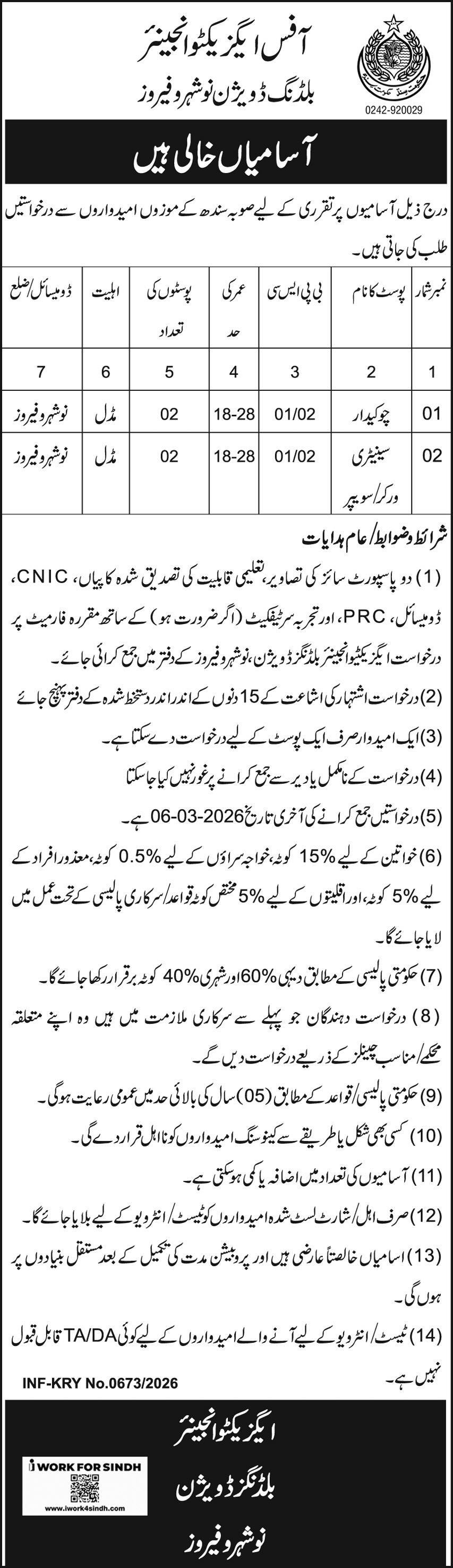 Building Division Naushahro Feroze Jobs 2026 For Chowkidar announce the Contract career opportunities for the post of See Below Ad in Sindh, Karachi for the fresh and experienced candidates on Contract basis who have Check Advertisement degree. Posted date of this post is 21/02/2026 and the last date is 07/03/2026. if you are eligible for this job apply before due date.