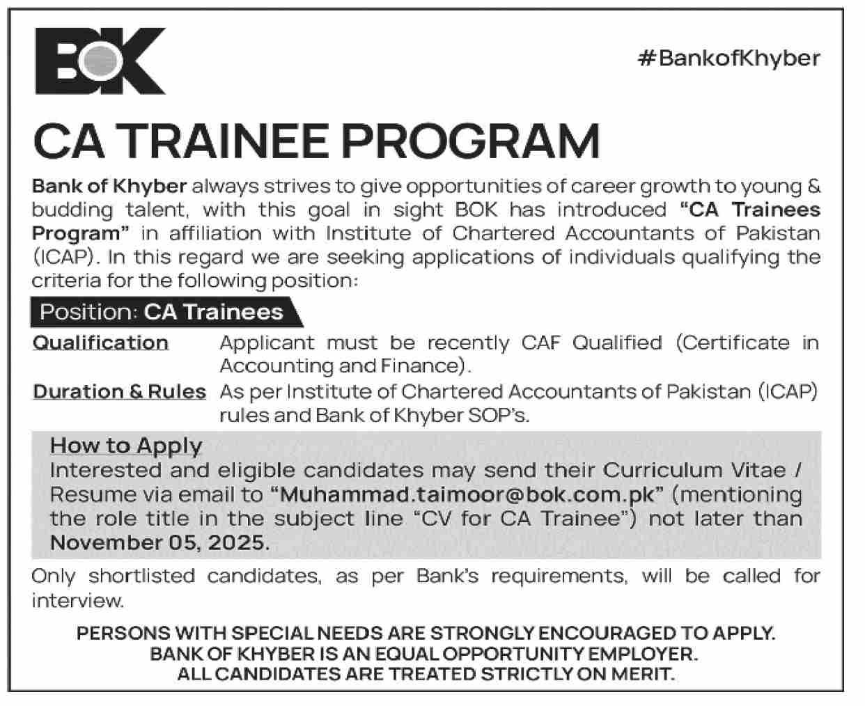 Interested and eligible candidates may send their Curriculum Vitae / Resume via email to “Muhammad.taimoor@bok.com.pk” (mentioning the role title in the subject line “CV for CA Trainee”) not later than November 05, 2025.