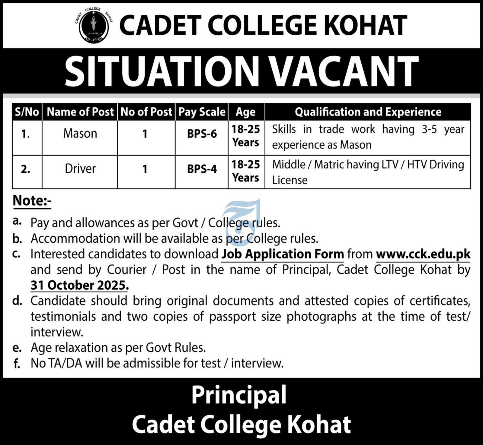 c. Interested candidates to download Job Application Form from and send by Courier / Post in the name of Principal, Cadet College Kohat by 31 October 2025.