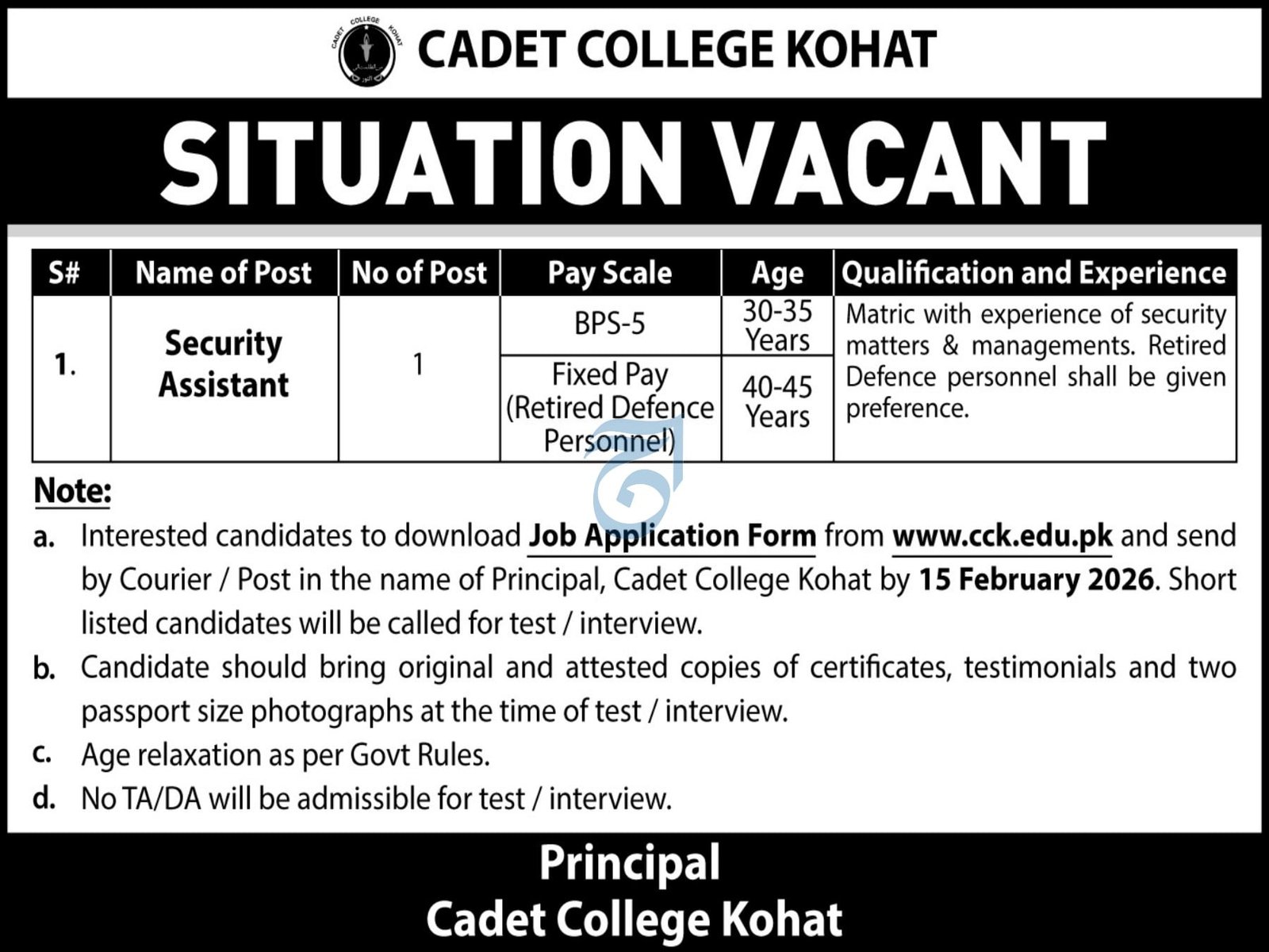 a. Interested candidates to download Job Application Form from and send by Courier / Post in the name of Principal, Cadet College Kohat by 15 February 2026. Short listed candidates will be called for test / interview.
