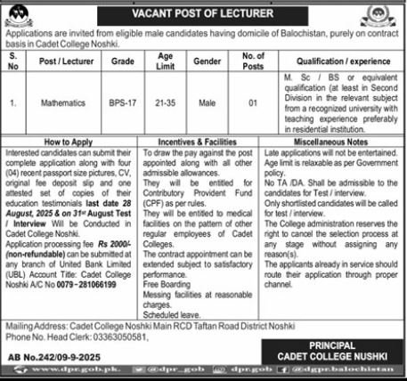 Cadet College Nushki Jobs 2025 announce the Contract career opportunities for the post of See Below Ad in Balochistan, Noushki for the fresh and experienced candidates on Contract basis who have Check Advertisement degree. Posted date of this post is 10/09/2025 and the last date is 25/09/2025. if you are eligible for this job apply before due date.
