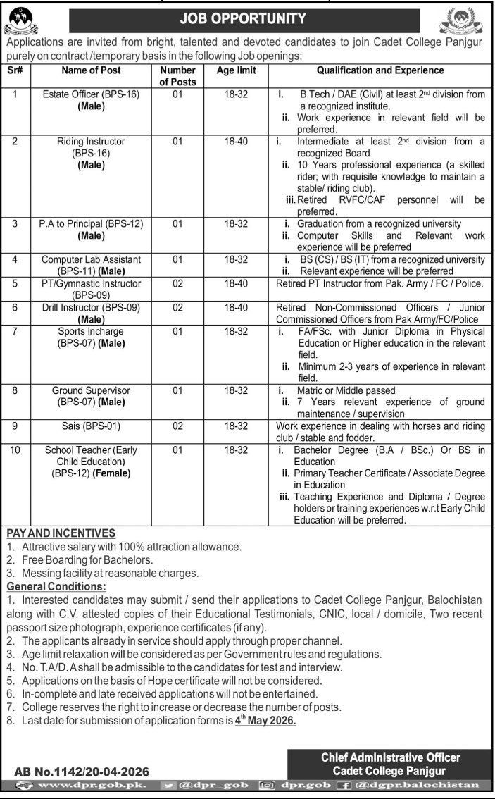 Cadet College Panjgur Jobs 2026 For School Teacher announce the Contract career opportunities for the post of See Below Ad in Balochistan, Panjgoor for the fresh and experienced candidates on Contract basis who have Check Advertisement degree. Posted date of this post is 21/04/2026 and the last date is 04/05/2026. if you are eligible for this job apply before due date.