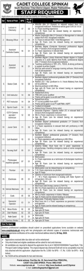 Cadet College Spinkai Jobs 2025 For Lecturers announce the Contract career opportunities for the post of See Below Ad in Khyber Pakhtunkhwa, South Waziristan for the fresh and experienced candidates on Contract basis who have Check Advertisement degree. Posted date of this post is 08/09/2025 and the last date is 20/09/2025. if you are eligible for this job apply before due date.