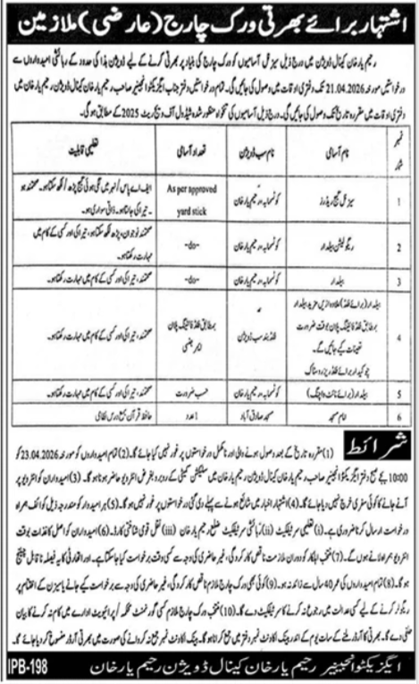 Canal Division Rahim Yar Khan Jobs 2026 announce the Contract career opportunities for the post of See Below Ad in Punjab, Rahim Yar Khan for the fresh and experienced candidates on Contract basis who have Check Advertisement degree. Posted date of this post is 16/04/2026 and the last date is 01/05/2026. if you are eligible for this job apply before due date.