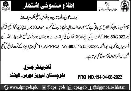 Cancelation of Balochistan Levies Force Killah SaifUllah Job announce the Permanent career opportunities for the post of See Below Ad in Balochistan, Killa Saifullah for the fresh and experienced candidates on Permanent basis who have Check Advertisement degree. Posted date of this post is 05/08/2022 and the last date is 05/08/2022. if you are eligible for this job apply before due date.