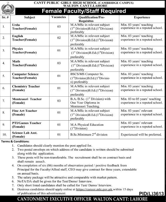 Cantt Public girls School Waltton Cantt Lahore Jobs 2023