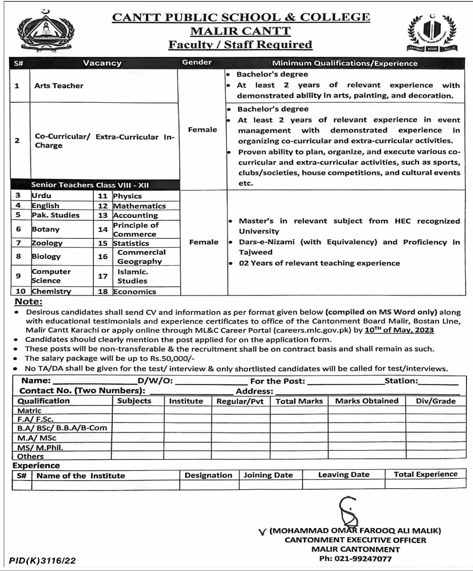 Cantt Public School & College Malir Cantt Jobs 2023 announce the Contract career opportunities for the post of See Below Ad in Sindh, Karachi for the fresh and experienced candidates on Contract basis who have Check Advertisement degree. Posted date of this post is 04/05/2023 and the last date is 10/05/2023. if you are eligible for this job apply before due date.