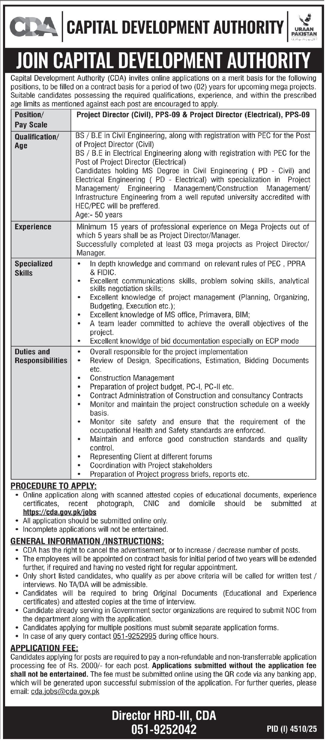 Capital Development Authority CDA Islamabad Jobs 2025 announce the Contract career opportunities for the post of See Below Ad in Federal, Islamabad for the fresh and experienced candidates on Contract basis who have Check Advertisement degree. Posted date of this post is 30/11/2025 and the last date is 15/12/2025. if you are eligible for this job apply before due date.