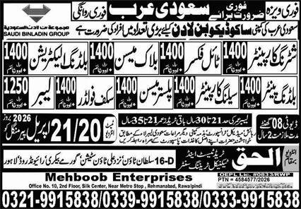Ceiling Carpenter & Building Electrician Jobs 2026 announce the Contract career opportunities for the post of See Below Ad in Saudi Arabia for the fresh and experienced candidates on Contract basis who have Check Advertisement degree. Posted date of this post is 15/04/2026 and the last date is 21/04/2026. if you are eligible for this job apply before due date.