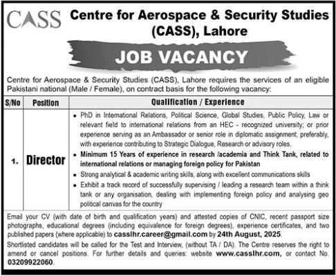 Centre For Aerospace & Security Studies CASS Jobs 2025 announce the Contract career opportunities for the post of See Below Ad in Punjab, Lahore for the fresh and experienced candidates on Contract basis who have Check Advertisement degree. Posted date of this post is 03/08/2025 and the last date is 24/08/2025. if you are eligible for this job apply before due date.