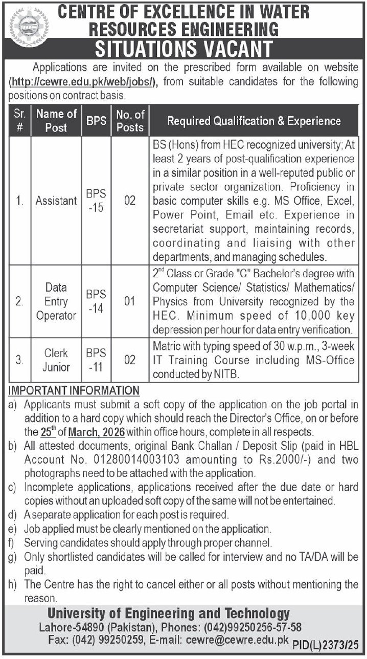Centre Of Excellence In Water Resources CEWRE Jobs 2026 announce the Contract career opportunities for the post of See Below Ad in Punjab, Lahore for the fresh and experienced candidates on Contract basis who have Check Advertisement degree. Posted date of this post is 26/02/2026 and the last date is 25/03/2026. if you are eligible for this job apply before due date.