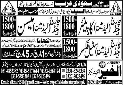 Charge Hand Jobs In Saudi Arabia 2026 announce the Contract career opportunities for the post of See Below Ad in Saudi Arabia for the fresh and experienced candidates on Contract basis who have Check Advertisement degree. Posted date of this post is 01/03/2026 and the last date is 05/03/2026. if you are eligible for this job apply before due date.