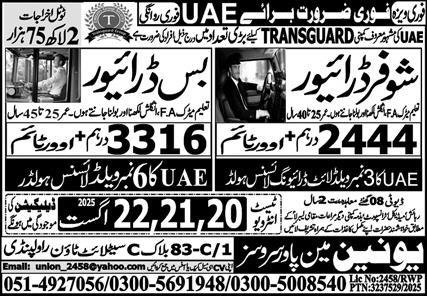 Chauffeur Driver & Bus Driver Jobs 2025 In UAE announce the Contract career opportunities for the post of See Below Ad in United Arab Emirates for the fresh and experienced candidates on Contract basis who have Check Advertisement degree. Posted date of this post is 19/08/2025 and the last date is 22/08/2025. if you are eligible for this job apply before due date.