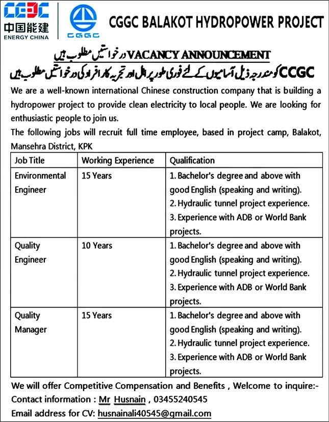 Chinese Construction Company Balakot Jobs 2023 announce the Contract career opportunities for the post of See Below Ad in Khyber Pakhtunkhwa for the fresh and experienced candidates on Contract basis who have Check Advertisement degree. Posted date of this post is 28/11/2023 and the last date is 12/12/2023. if you are eligible for this job apply before due date.