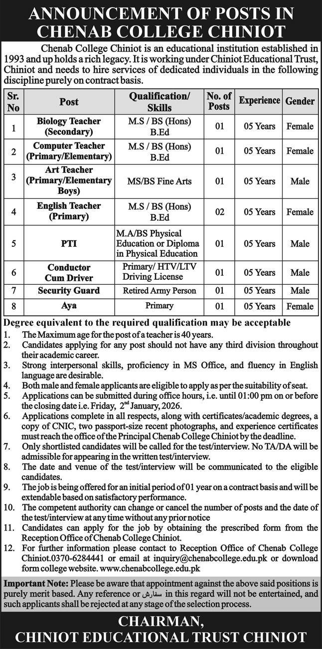 Chiniot Educational Trust Chiniot Jobs 2026 For Teachers announce the Contract career opportunities for the post of See Below Ad in Punjab, Chiniot for the fresh and experienced candidates on Contract basis who have Check Advertisement degree. Posted date of this post is 25/12/2025 and the last date is 02/01/2026. if you are eligible for this job apply before due date.