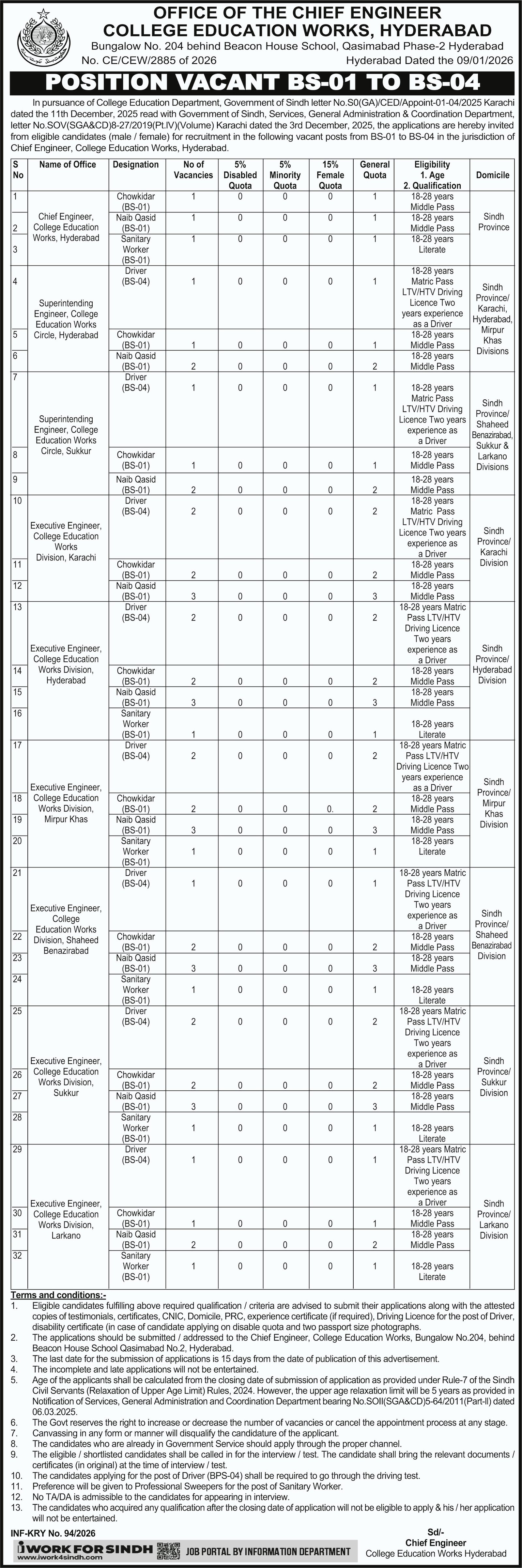 College Education Department Hyderabad Jobs 2026 announce the Contract career opportunities for the post of See Below Ad in Sindh, Hyderabad for the fresh and experienced candidates on Contract basis who have Check Advertisement degree. Posted date of this post is 13/01/2026 and the last date is 18/01/2026. if you are eligible for this job apply before due date.